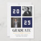 Celebrate your graduate's milestone with this navy modern photo collage graduation announcement. This design features two photo placeholders and a bold, varsity layout with the year prominently displayed. Customise it with your graduate's name and high school. A stylish and contemporary way to announce their achievement!