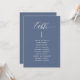 Help your guests find their table with this elegant modern seating plan cards with guests names. Design in navy blue background and white text. Double sided cards so guests can look from both, front or back for their names if case you like to use then in a hanging display. Clear space all around giving you the liberty to use clips or punch hole for hanging displays, or use table holder/frame. Modern hand written calligraphy elements. Part of our "Elegant Bliss" collection with a variety of coordinating products available, including table number cards and menus.