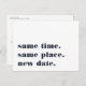 Need to postpone or reschedule your wedding? Let guests know with these modern and lighthearted postcards in white with rich navy blue lettering. Funny and clever typography-based design features "same time, same place, new date" on front, with your new wedding date and details on the back.