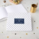 Anchors aweigh! Our coastal chic guest book is perfect for inviting your boat or yacht guests to share their memories and good wishes. Featuring a classic nautical colour palette of navy blue and white, our guest book's front and back are covered in a tiny anchor pattern, with a solid navy spine. Personalise the front and spine with your boat name.