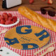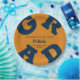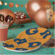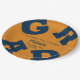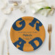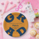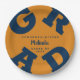 GRAD in bold navy blue lettering curves around the edges of these light orange graduation party paper plates - available in 2 sizes. Congratulations above the name of your graduate and the Class of below. The perfect addition to your table decor for upcoming grad parties. **TIP: Click on CUSTOMIZE button; click on COLOR box on top right; enter your colour hex code in the #xxxxxx box to match your school colours. SEE ENTIRE COLLECTION of pre-done colour combinations and more in our store.