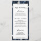 A classic dinner menu offering starters, main course and dessert selections. Titles are written in a classic black swash font calligraphy and the menu selections are in an easy to read block text. The menu is fully customisable for any occasion. A navy wedding invitation suite featuring a navy blue watercolor background with cascading navy and white peony florals and silver eucalyptus greenery. An elegant swash font calligraphy highlights the suite of invites and accessory stationery.