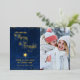 “May your days be merry & bright.” A playful, real gold foil calligraphy script quote, star, and confetti dots against a navy blue marble watercolor background on the left, and the photo of your choice on the right, help you usher in Christmas and New Year. A faux gold foil ombre background sprinkled with faux gold foil confetti dots is on the back. Feel the warmth and joy of the holiday season whenever you send this trendy and festive personalised holiday real gold foil photo greeting card. Matching and coordinating envelopes, stickers, giftwrap, pillows, housewares, jewellery, and other products are also available in my “Christmas Days Be Merry & Bright” store collection. Send this to someone special!