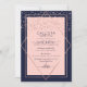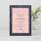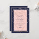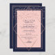 This elegant and modern sweet sixteen birthday party invitation is ideal for a classy and formal event. It features a faux printed sparkly rose gold glitter confetti sprinkled over a thin geometric diamond and rectangle border with a navy blue thick border underneath and blush pink fill. It's chic, luxurious, pretty, simple, and trendy; the perfect design for your special day.