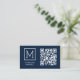 This business card features a minimal monogram logo design on a navy background with QR code on the front. Personalise it with your own text.