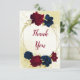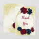 Beautiful wedding thank you card featuring dark navy blue and red flowers and gold leaves .