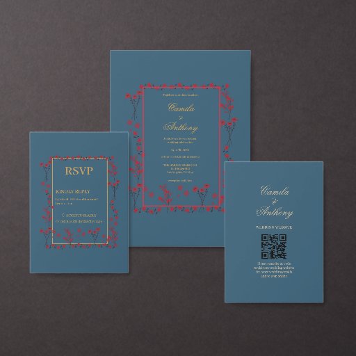 Navy Red Gold Floral Border Wedding Save The Date