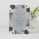 This design features deep navy roses and creamy white peonies set against a muted slate gray background. Shimmering gold foliage accents the rich floral arrangement, creating a sophisticated and regal aesthetic. The color palette is perfect for a formal winter ceremony.