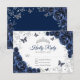 Navy silver floral Quinceanera RSVP reply card. Features, script font, silver butterflies, watercolor roses and tiara. Perfect for an elegant princess style glam celebration. Personalize with your own details.