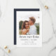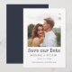 Simple elegant photo save the date featuring your best engagement photo over a white background. Card reverse to a solid Navy blue colour fully changeable to fit your wedding or photo colour scheme.