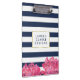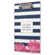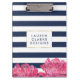 This clipboard features a bold navy blue and white stripe background, faux gold border, and a pretty pink peony in soft watercolors. Coordinates with our Navy Stripe & Pink Peony office supplies, paper products, and accessories. Customise with a monogram, name or text of your choice!