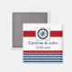 navy blue and white stripes with red border and white dotted border featuring an compass, Mod nautical wedding save the date magnet favours. Matching products also available.