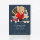 Honor the memory of a beloved child with this touching funeral announcement. This design features a cherished photograph of your little one, surrounded by sweet illustrations of a toy car and teddy bear, set against a classic navy blue background. The phrase 'In Loving Memory' elegantly precedes the name and dates, followed by the service details. This announcement serves as a gentle and loving way to share the news of a memorial service, allowing friends and family to gather and remember your precious child. The back of the card offers space for additional details like the reception venue or a personal message, ensuring all necessary information is conveyed with warmth and grace.