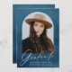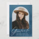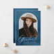 Elegant graduation announcement featuring the graduate's photo inside of an arch frame with a navy blue watercolor background. "Graduate" is displayed in a white modern calligraphy script with the graduate's name, school, and grad year shown below. The photo graduation announcement reverses to display 6 photos in a grid-style layout.