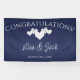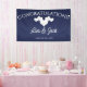 Navy Wedding Banner with Elegant White Hearts. This hanging Wedding Reception Banner is designed with soft white hearts on a navy coloured background. The text includes: Congratulations!, The Bride and Groom's First Names and Wedding Date. To personalise, simply insert your details into our easy template, replacing the sample text.