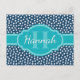 Stylish, trendy dark blue and white dot pattern in the background, topped with a bright teal blue label featuring a customisable name and monogram template.