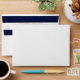 This A7 envelope matches the navy blue and white nautical faux burlap stripe wedding invitation shown below.