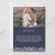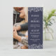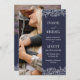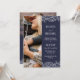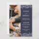 Double sided 2 in 1 photo wedding invitation in navy blue with elegant white fonts and the lace-like outlines of hand drawn flower arrangements with roses and baby's breath. Add a photo on the front of the floral wedding invitation, and another photo on the back where you can also add details.