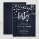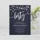 40th Birthday Party Invitation. Rustic design with navy wood pattern. Classy invite card featuring fairy string lights and white script font. Perfect for a stylish fortieth bday celebration. Personalise with your own details. Can be customised for any age! Printed Zazzle invitations or instant download digital printable template.