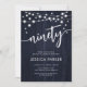 90th Birthday Party Invitation. Rustic design with navy white wood pattern. Classy invite card featuring fairy string lights and white script font. Perfect for a stylish ninetieth bday celebration. Personalise with your own details. Can be customised for any age! Printed Zazzle invitations or instant download digital printable template.