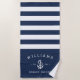 Add a unique custom touch to your beach house with our personalised beach towels. Design features classic nautical navy blue and white stripes with your family name, "beach house" and year established flanking a white nautical rope and anchor illustration.