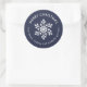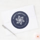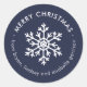 Affordable custom printed Merry Christmas round gift tag stickers personalised with your text. This simple modern holiday design features a white snowflake on a navy blue background. Use the design tools to choose any background colour, edit text fonts and colours or upload your own photos to design your own unique holiday gift labels, envelope seals or stickers.