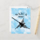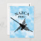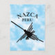 Famous Nazca Lines drawing based on the desert hummingbird geoglyph with curved text. Custom postcards. Black design version with blue sky in the background.