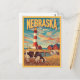 Celebrate the charm of Nebraska with this vintage-inspired postcard design. Featuring grazing cows, classic red barns, and a striking lighthouse under a colourful sky, this retro-style illustration captures the spirit of rural Americana. Perfect as a keepsake, travel gift, or collectable for anyone who loves Nebraska’s unique countryside beauty.