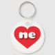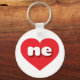 This key chain features a vibrant red heart containing the bold, white, rounded lower case letters ne, a playful abbreviation for Nebraska, the cornhusker state.