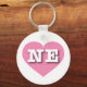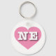 This keychain features a vibrant pink heart containing the bold, white, upper case letters NE, the official abbreviation for Nebraska, the corn husker state.