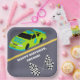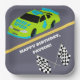 Create personalised party supplies that are perfect for Need 4 Speed themed 4th birthday parties. These paper plates feature an illustration of a stock car style race car in lime green and bright blue. The number 4 car has the slogan NEED 4 SPEED on the hood. The graphic is set against a grey race track background and accompanied by two chequered flags. The plates are ready to be personalised with your slogan in bold white lettering.