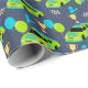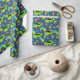 This fun wrapping paper is perfect for 4th birthday parties. The wrapping paper features illustrations of stock car style race cars in lime green and bright blue with the number 4 and the slogan NEED 4 SPEED. Along with the race cars are balloons, trophies, racking helmets and chequered flags. The graphics are set against a navy blue background.