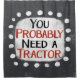 A fun and cute typographic message design that says "You Probably Need A Tractor". It has black and red text on a white rectangle with funky, playful white dots surrounding it, all on a grey background.