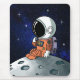 A whimsical illustration of a cute cartoon astronaut, spaceman sitting on top of the moon. The spaceman is wearing an orange spacesuit, white gloves and white helmet with a black visor. He has a badge at the top of his arm and dials and buttons on the front of his suit. On his back is a backpack for his air. He has one arm to his side and the other bent up to his helmet to make him look like he is thinking. His legs are outstretched in front of him. He is sitting on top of a grey/white moon that has shadows and craters. The background is a black and blue galaxy with bright white twinkling stars.
