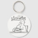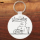 Funny negotiator's Keyring. Man in charge of negotiations is sitting at his desk. He is wearing boxing gloves which have the word Clout on them