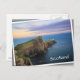 Postcard of a landscape with the iconic Neist Point Lighthouse, built on the cliffs at the western coast of the island of Skye, one of the Hebrides in Scotland, at sunset with a white edge and in white the text 'Scotland'. The photo is a bit rotated to create the illusion of it laying loose.