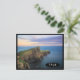 Postcard of a landscape with the iconic Neist Point Lighthouse, built on the cliffs at the western coast of the island of Skye, one of the Hebrides in Scotland, at sunset with a black edge and in a black round bullet the text 'Skye'.