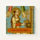 In this detail from a splendid NeoGothic Swiss devotional print, St. Cecilia of Rome (3rd century) is depicted playing an upright pipe organ against an aqua background patterned with gold dots and stars. Her long auburn hair hangs loose and tumbles over her shoulders and down her back. She wears a mediaeval-style, cream-coloured gown lined in green over a dark red-orange kirtle. The gown has a square neckline and bell sleeves. + Despite her private vow of virginity, St. Cecilia was forced into an arranged marriage with a pagan named Valerian. During the festivities, it is said, St. Cecilia “sang in her heart to the Lord” instead of revelling; hence, her patronage of musicians (especially organists) and singers The marriage was never consummated. The long and the short of it is that her new husband, having seen an apparition of the angel that guarded his wife’s virtue, converted to Christianity and respected her vow. + Epilog: St. Cecilia, her husband St. Valerian, and her brother-in-law St. Tiburtius were all martyred. But, that’s a story for another day! + Feast: November 22 + Image Credit (BNG 02): Detail of an antique NeoGothic image of St. Cecilia, originally published in chromolithography by Benziger & Co., Einsiedeln, Switzerland, late 19th-early 20th century, from the designer’s private collection of religious ephemera.
