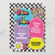 Neon 90's retro Five is a vibe 5th birthday invitation with hearts, daisies, disco ball and chequered background.