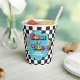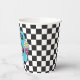 Neon 90's retro Seven is a vibe 7th birthday paper cups with hearts, daisies, disco ball and chequered background.