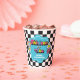 Neon 90's retro Thirteen is a vibe 13th birthday paper cups with hearts, daisies, disco ball and chequered background.