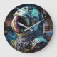 This Clock features a retro-futuristic astronaut in a high-contrast sci-fi illustration, merging modern pop art with a cyberpunk aesthetic. The detailed helmet visor reflects a vibrant space galaxy in neon turquoise, electric purple and golden accents, surrounded by cosmic dust and planets.