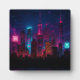 A vibrant, dark cityscape illuminated by brilliant neon and magenta lights, evoking a strong sense of cyberpunk and 80s retrowave aesthetics. The towering skyscrapers stand against a brick wall, covered in a haze of electric blues and pinks.
