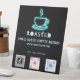 Stay connected with coffee / café customers using this tabletop pedestal sign that features a neon blue coffee cup with customisable text and social media qr codes on black background