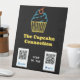 Modern and stylish QR code payment option tabletop pedestal sign for your cupcake stand, bakery or farmer's market booth, featuring a neon cupcake on black background. Add your custom qr code and company details.