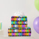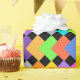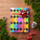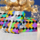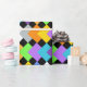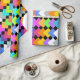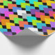 This wrapping paper has a geometric design of neon diamonds overlapping each other on a field of black.