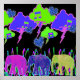 Neon elephants on black background with clouds, lightning, music and hearts.
