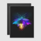 Antique, mechanical firefly with light bulb and thin wings glows orange, purple, turquoise on black background. Steampunk style.