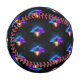 Antique, mechanical firefly with light bulb and thin wings glows orange, purple, turquoise on black background. Steampunk style.