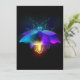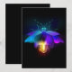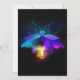 Antique, mechanical firefly with light bulb and thin wings glows orange, purple, turquoise on black background. Steampunk style.